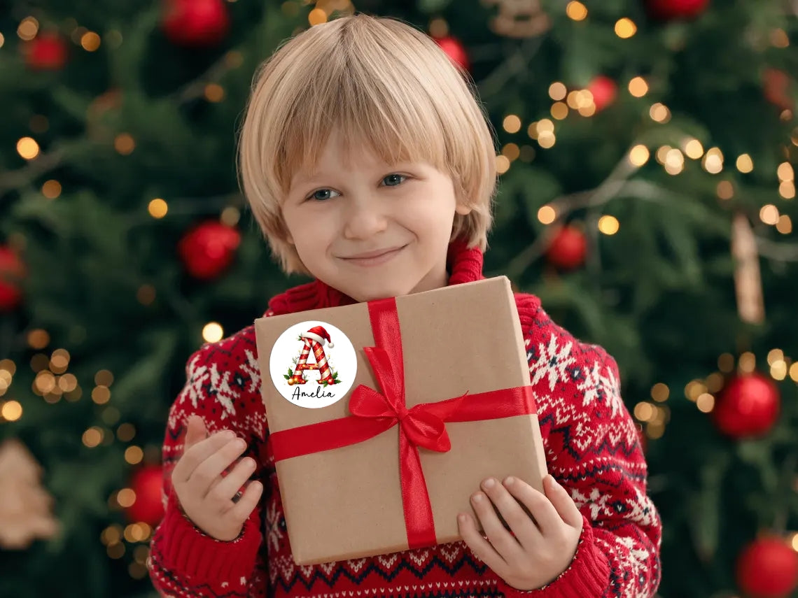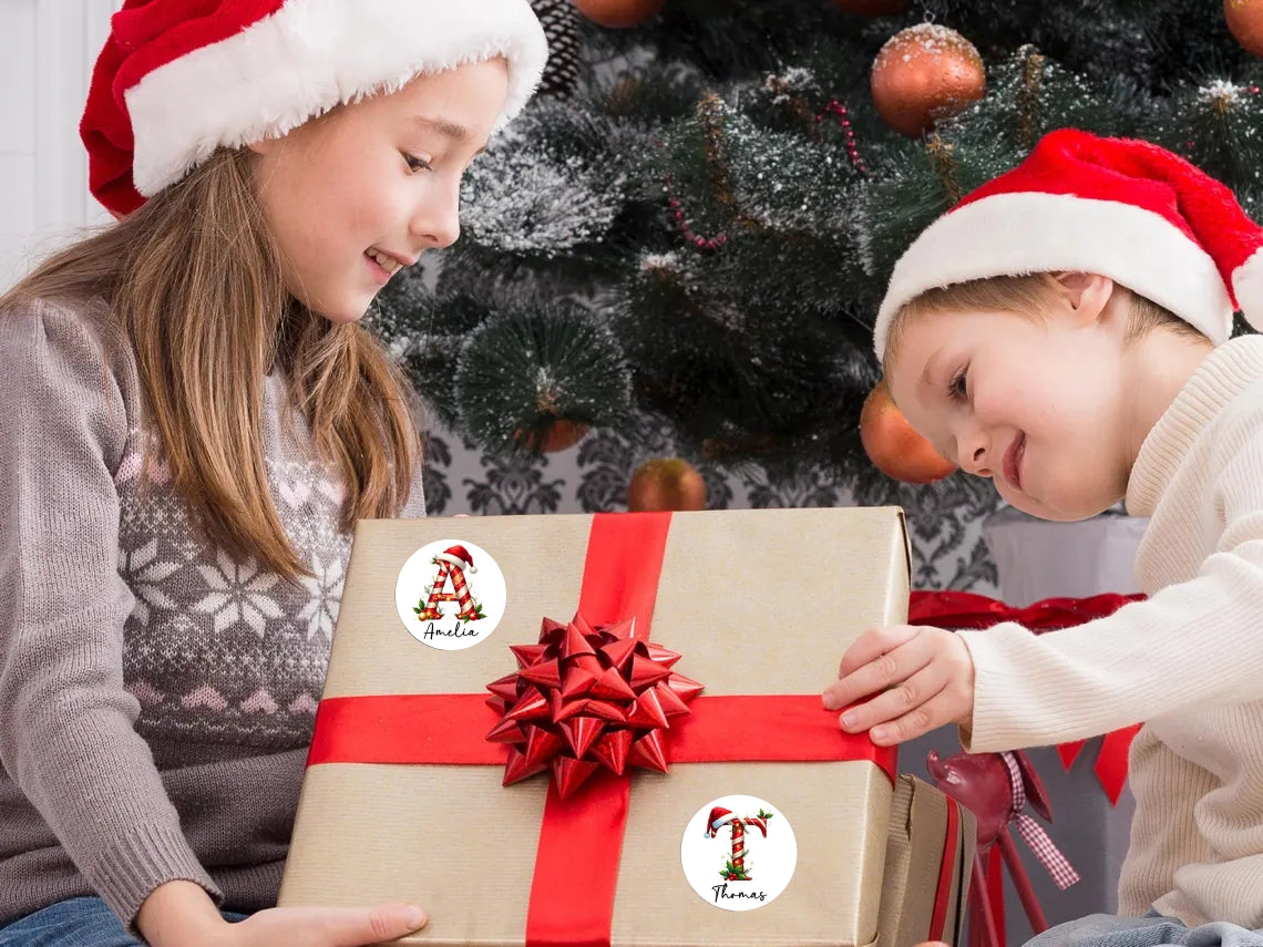 Each sticker features your name’s first letter in a playful red-and-white candy cane design, complete with twinkling lights and a tiny Santa hat — festive, cute, and totally unique!