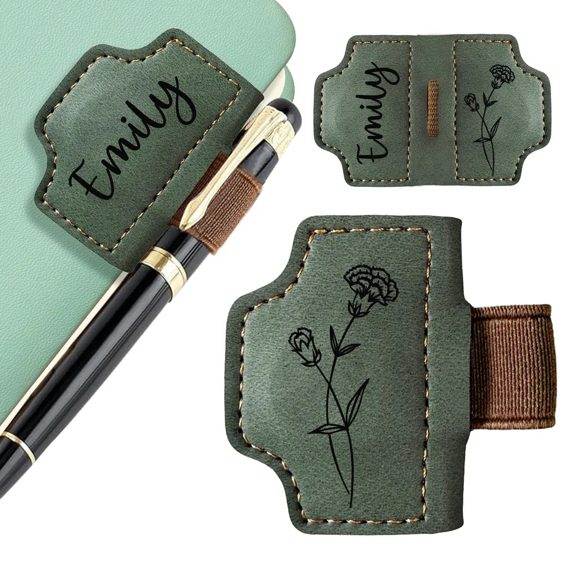 Personalized Leather Bookmark with Birth Flower & Pen Holder