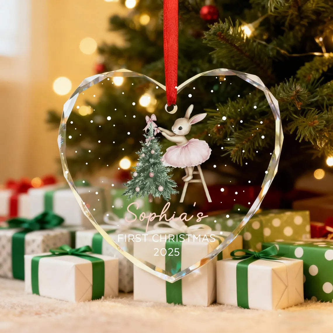 Make your Christmas tree extra magical with our Pink Bunny Christmas Ornament, available in Round or Heart shape. Featuring an adorable pink bunny decorating a Christmas tree topped with a soft pink bow, this ornament adds sweetness and charm to every holiday season. Perfect for personalizing with your baby’s name and year. 🎀🌲✨